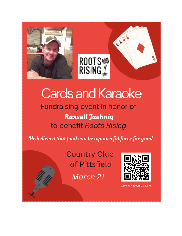 ROOTS RISING Cards and Karaoke FUNDRAISING EVENT IN HONOR OF RUSSELL JAEHNIG MAR.21 COUNTRY CLUB OF PITTSFIELD, MA 7:00 - 11:00 PM